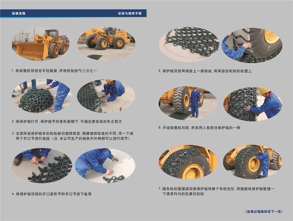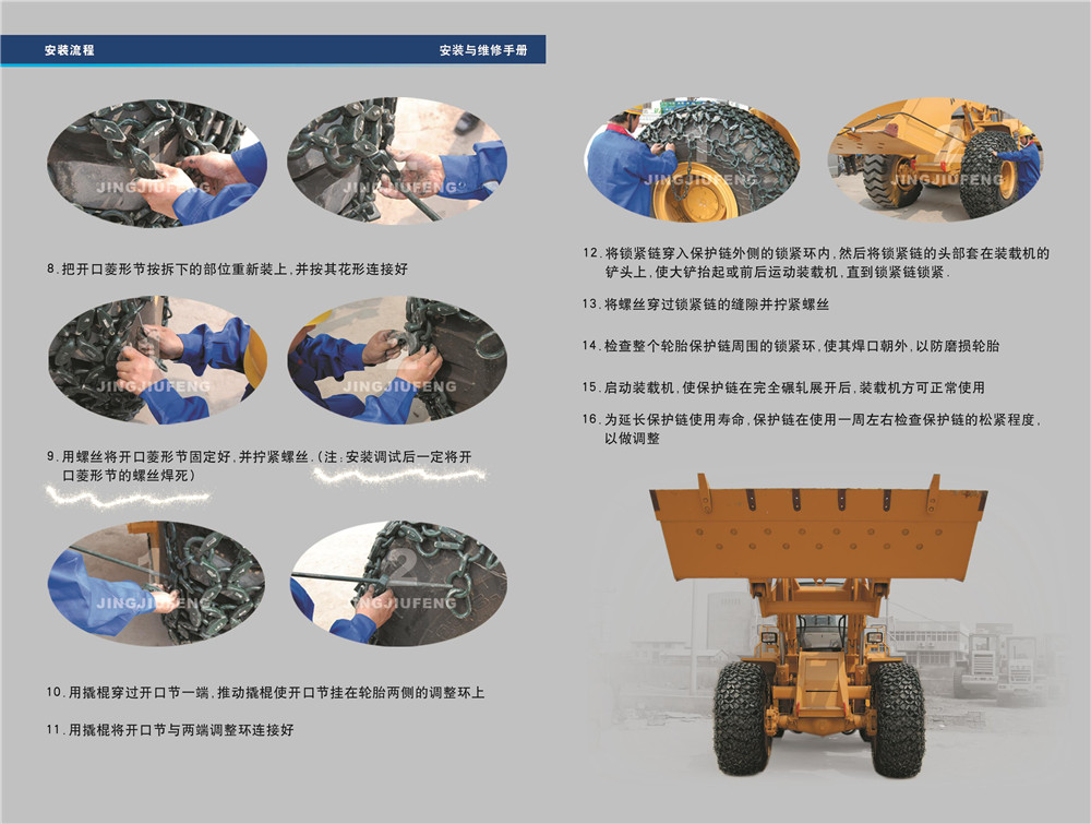 8.檢查整個(gè)輪胎保護(hù)鏈的鎖緊環(huán),使其焊口朝外,以免磨損輪胎。
